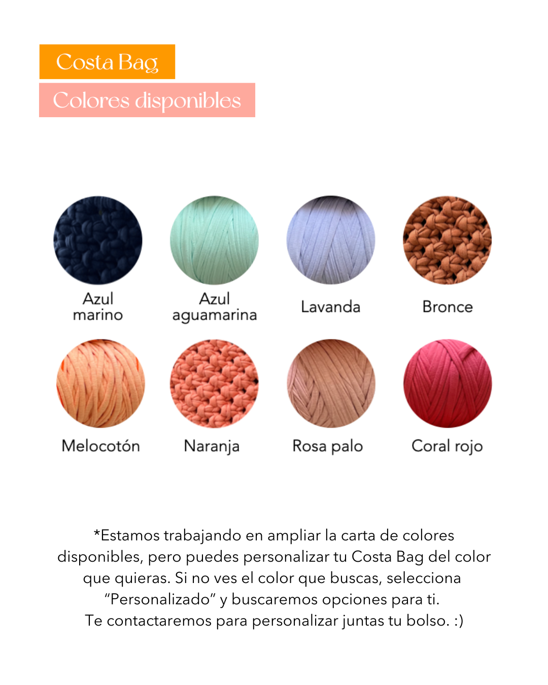Si no encuentras el color que buscas, si quieres el asa de un largo especial o quieres ver más fotos y opciones, selecciona "Personalizado" y te contactaremos para personalizar juntas tu bolso.