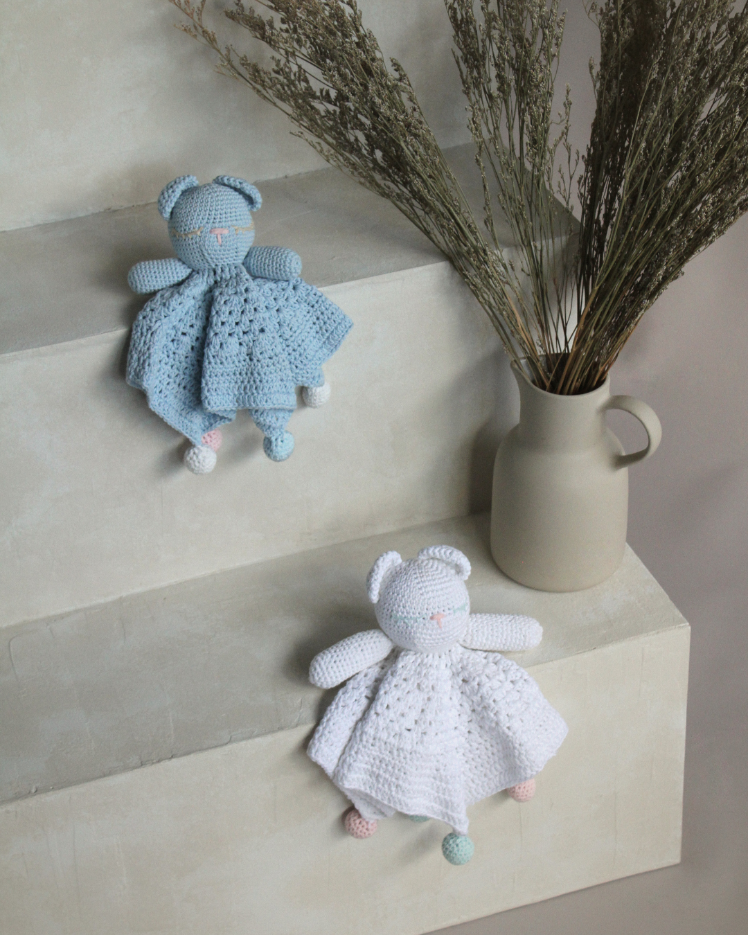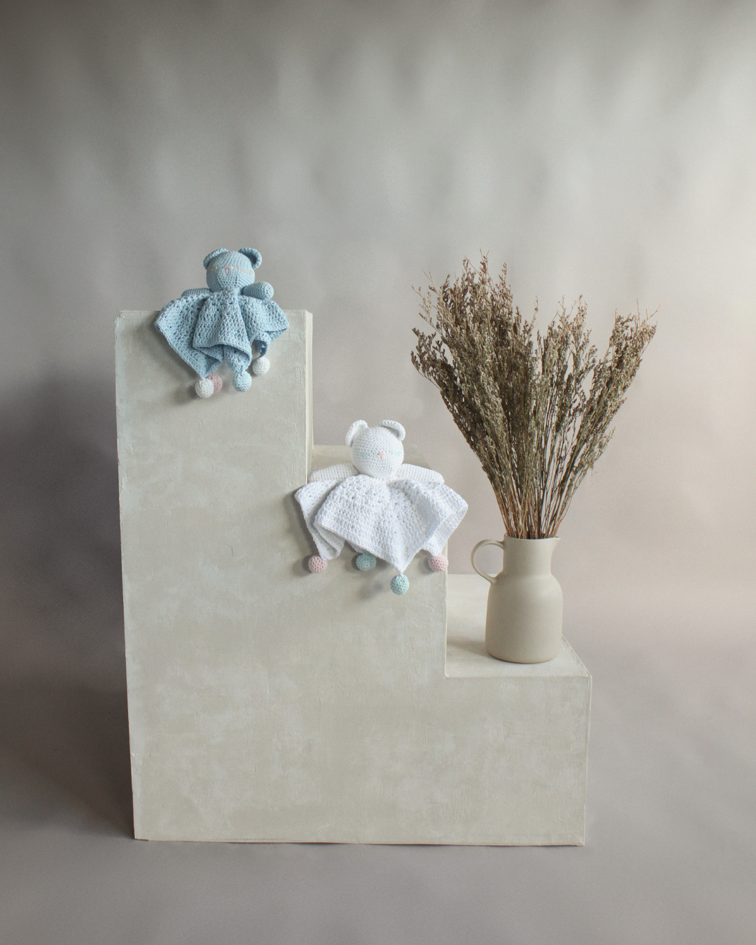 Cada doudou está tejido con hilo 100% de algodón hecho en España y lleva relleno hipoalergénico en la cabecita, los brazos y las borlas.