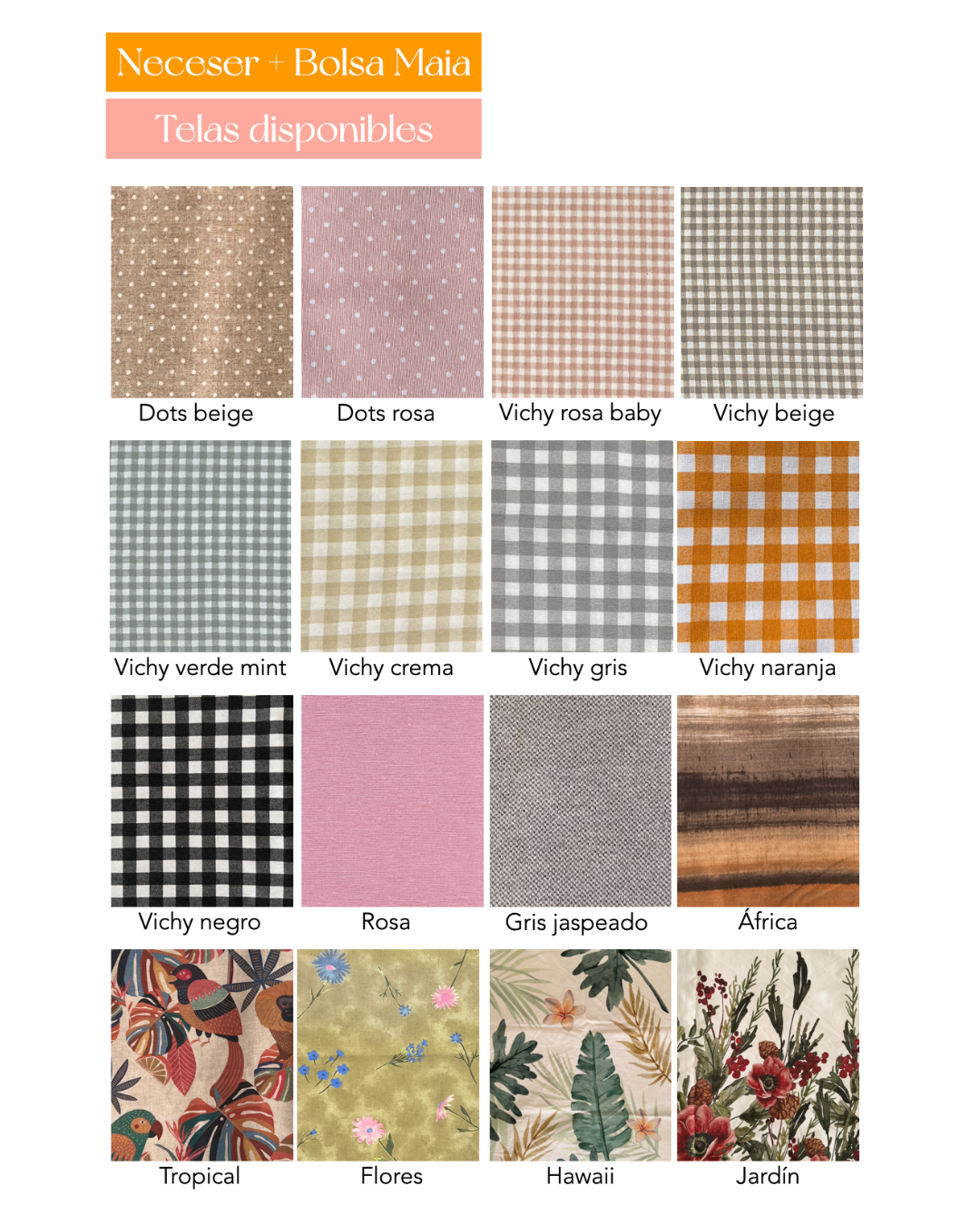 Personalízalo a tu gusto: escoge la tela que más te guste de los diseños disponibles y crearemos el neceser y la bolsita para ti, siguiendo nuestro propio patrón y diseño. También puedes escoger solo el neceser.