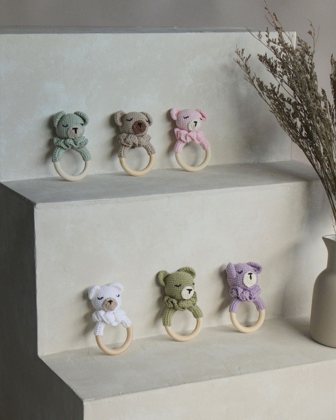El sonajero está tejido con hilo 100% de algodón hecho en España, lleva relleno hipoalergénico y un cascabel bien asegurado en su interior.