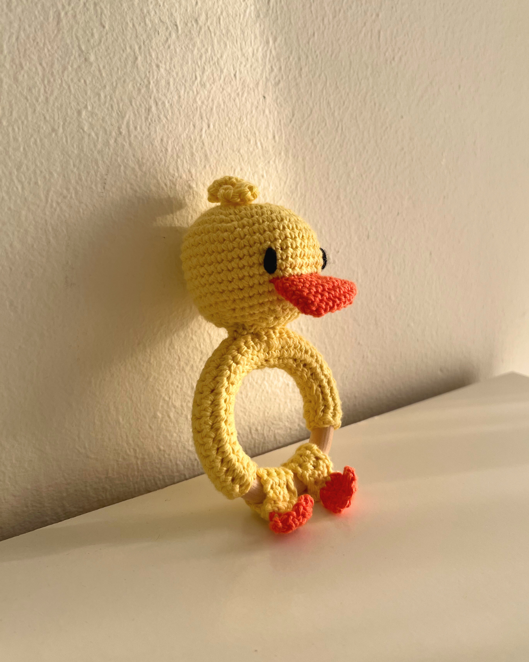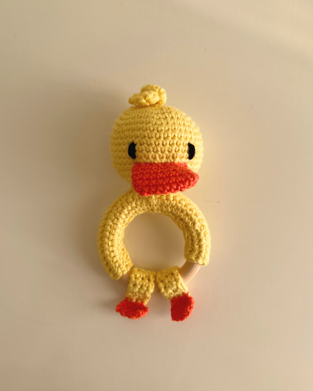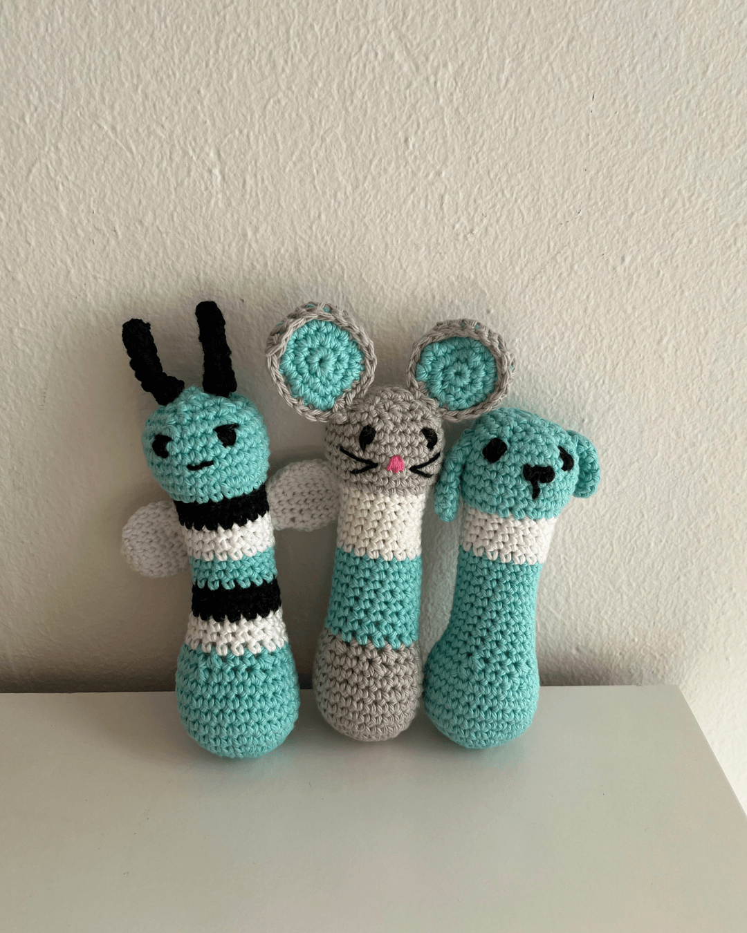 Cada sonajero está tejido con hilo 100% de algodón hecho en España, lleva relleno hipoalergénico y un cascabel bien asegurado en su interior.